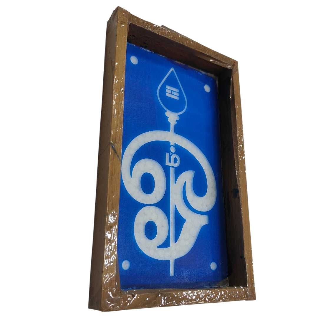Rectangular Wooden Frame Lord Murugan Vel inside "Ohm" design Rangoli Stencil – size 5 inches முருகன் வேல் & "ஓம்" கோலம்