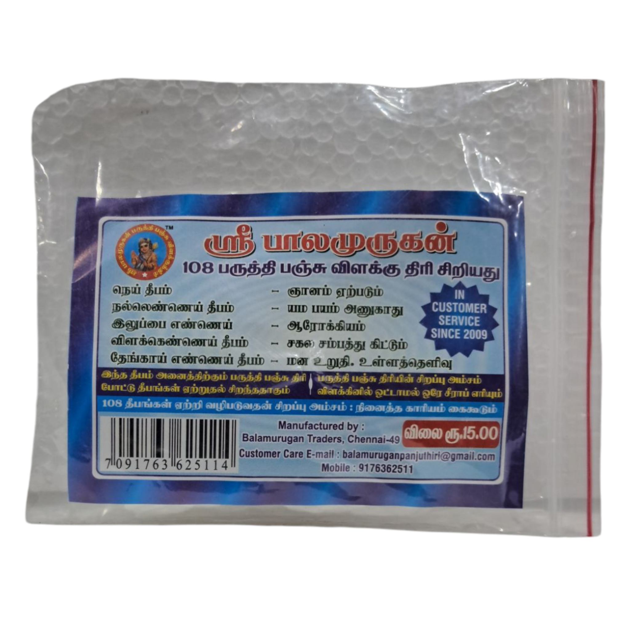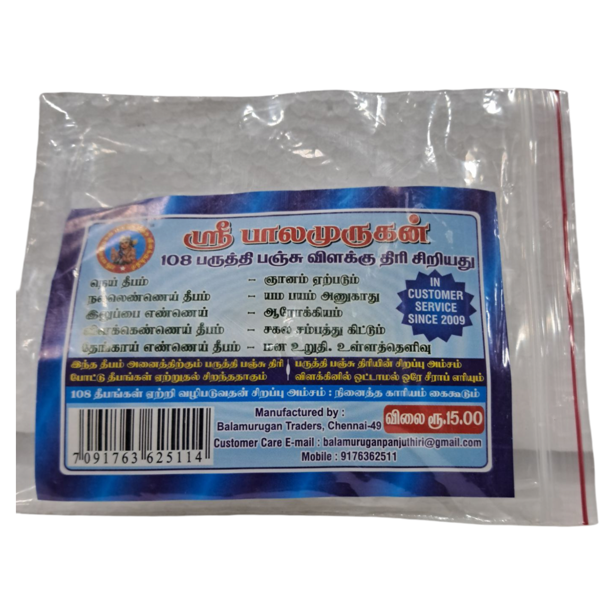 Sri Balamurugan 108 Small Cotton Lamp Wicks 3-inch ஸ்ரீ பாலமுருகன் பஞ்சு திரி