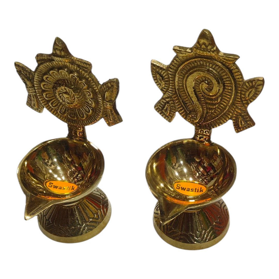 Sanghu Chakra Oval Deep Brass Deepak set size 4.8 inches - Pooja Worship & Excellant Wedding Gift-